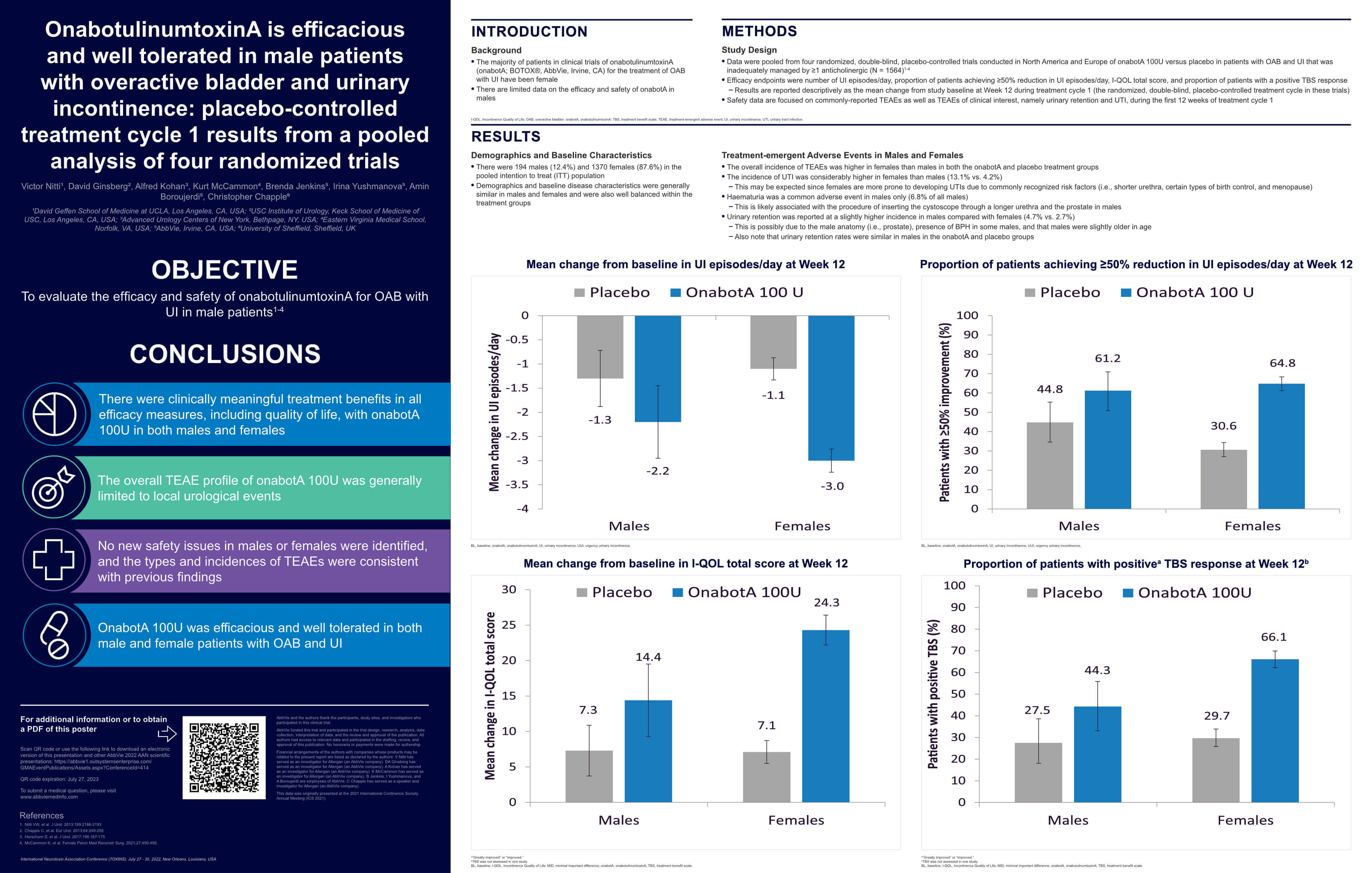 ONABOTULINUMTOXINA IS EFFICACIOUS AND WELL TOLERATED IN MALE PATIENTS WITH OVERACTIVE BLADDER AND URINARY INCONTINENCE: PLACEBO-CONTROLLED TREATMENT CYCLE 1 RESULTS FROM A POOLED ANALYSIS OF FOUR RANDOMIZED TRIALS